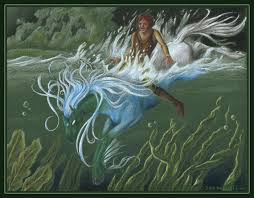 A paranormal horse from Celtic legend. Usually black in colour , however some tales speak of a white horse. It is known by its wet mane. It appears to be a lost pony usually roaming near water. Kelpies can transform in to beautiful woman or men drawing their victims to their pools and ultimately their death.